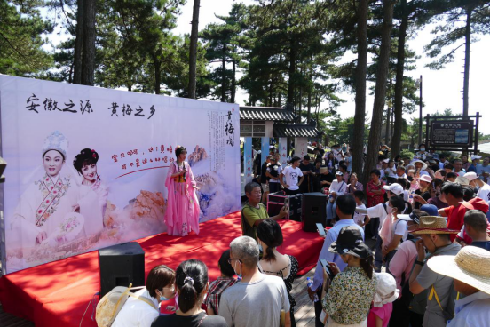 在游客服務(wù)中心及大龍窩索道上站廣場,多場黃梅戲連臺演出,臺上演員與臺下游客頻繁互動,婉轉(zhuǎn)悠揚的黃梅鄉(xiāng)音在山谷間蕩漾,廣大游客沉醉其中,真切感受到了“樹上的鳥兒成雙對,綠水青山帶笑顏”的意韻。