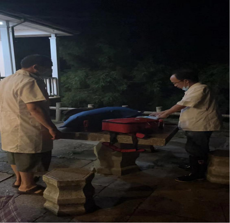 得悉萬女士的緊急狀況,指導員第一時間聯(lián)系了景區(qū)綜合執(zhí)法大隊大隊長劉運中,劉運中接到匯報后立刻安排天柱山急救站醫(yī)護人員與執(zhí)法隊員、景區(qū)派出所工作人員一起前往煉丹湖接待中心進行救助,安排客運公司人員駕駛急救車輛在大龍窩游客出口待命,同時向景區(qū)管委會相關(guān)領(lǐng)導和市疫情防控指揮部進行了匯報,并奔赴景區(qū)現(xiàn)場指揮救助。于是,雷雨交加的景區(qū)山徑夜幕中就出現(xiàn)了一群打著手電筒行色匆匆的一群人。